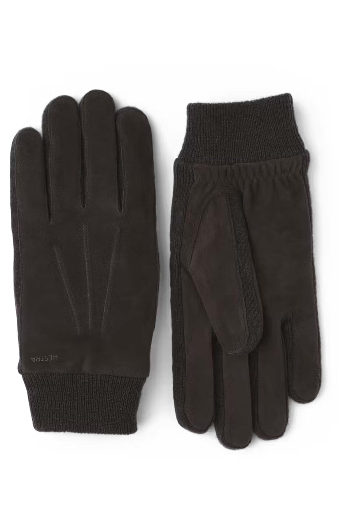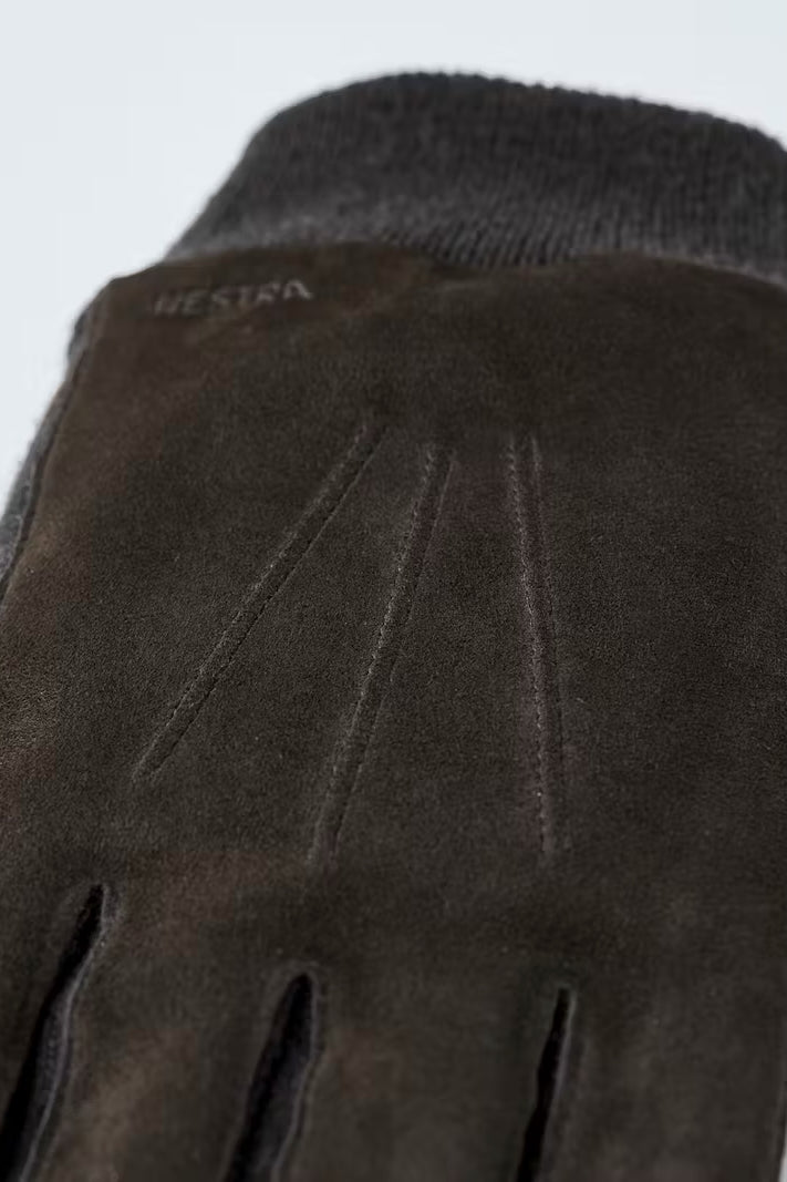 Seitenschichtel und Details aus Rippstrick-Wolljersey, während Handrücken und Handfläche aus italienischem Lammveloursleder gefertigt sind.