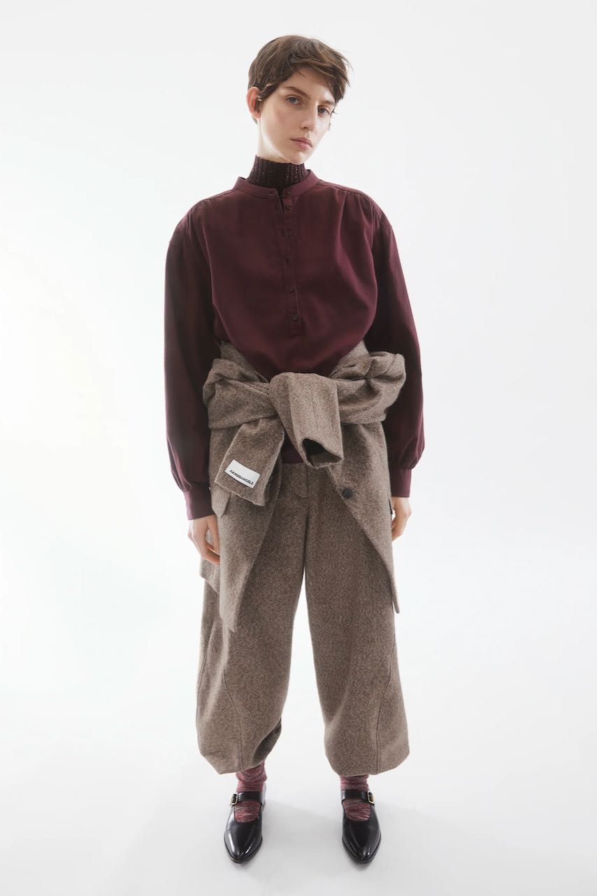 Hübsche Bluse mit überschnittener Schulter, Stehkragen und feiner Raffung.