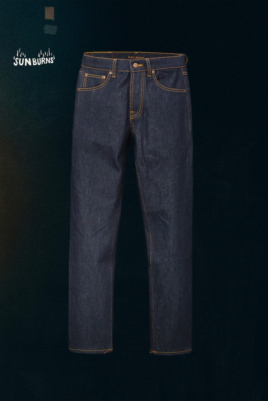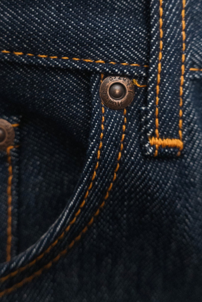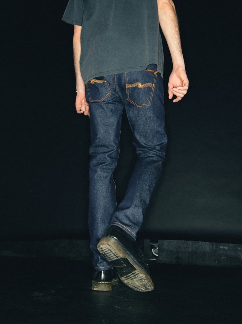 Slim-Fit-Jeans mit schmalem Bein aus einem Denimstoff, der oben mit Indigo und unten mit Schwefel gefärbt ist, wodurch ein tiefer, fast tintiger Farbton entsteht, der auch beim Ausbleichen seine Intensität behält. Dieser Stoff altert nicht einfach nur – er entwickelt sich weiter und schafft die Voraussetzungen für eine Abnutzung, die starke Kontraste und vielschichtige Charaktereigenschaften offenbart.